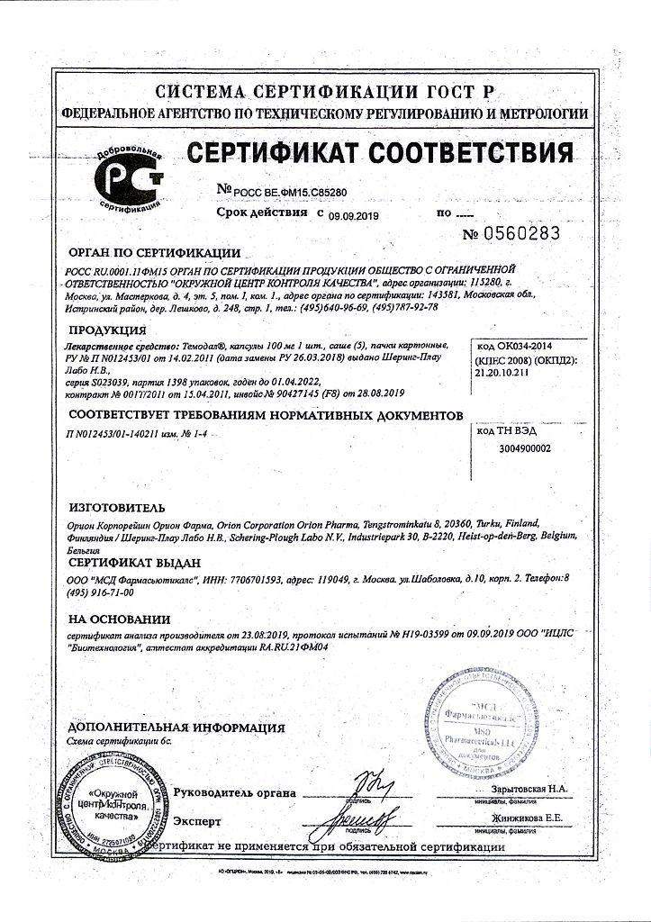 Применение. Капсулы Темодал принимаются за час до приема пищи. Взрослым и детям старше 3 лет, ранее не подвергавшимся химиотерапии начальная доза составляет 200 мг/м2 1 раз в сутки в течение 5 дней подряд в 28-дневном цикле лечения. Для пациентов, ранее проходивших курс химиотерапии, начальная доза – 150 мг/м2 с последующим ее повышением во втором цикле до 200 мг/м2. Максимальный курс лечения – 2 года.