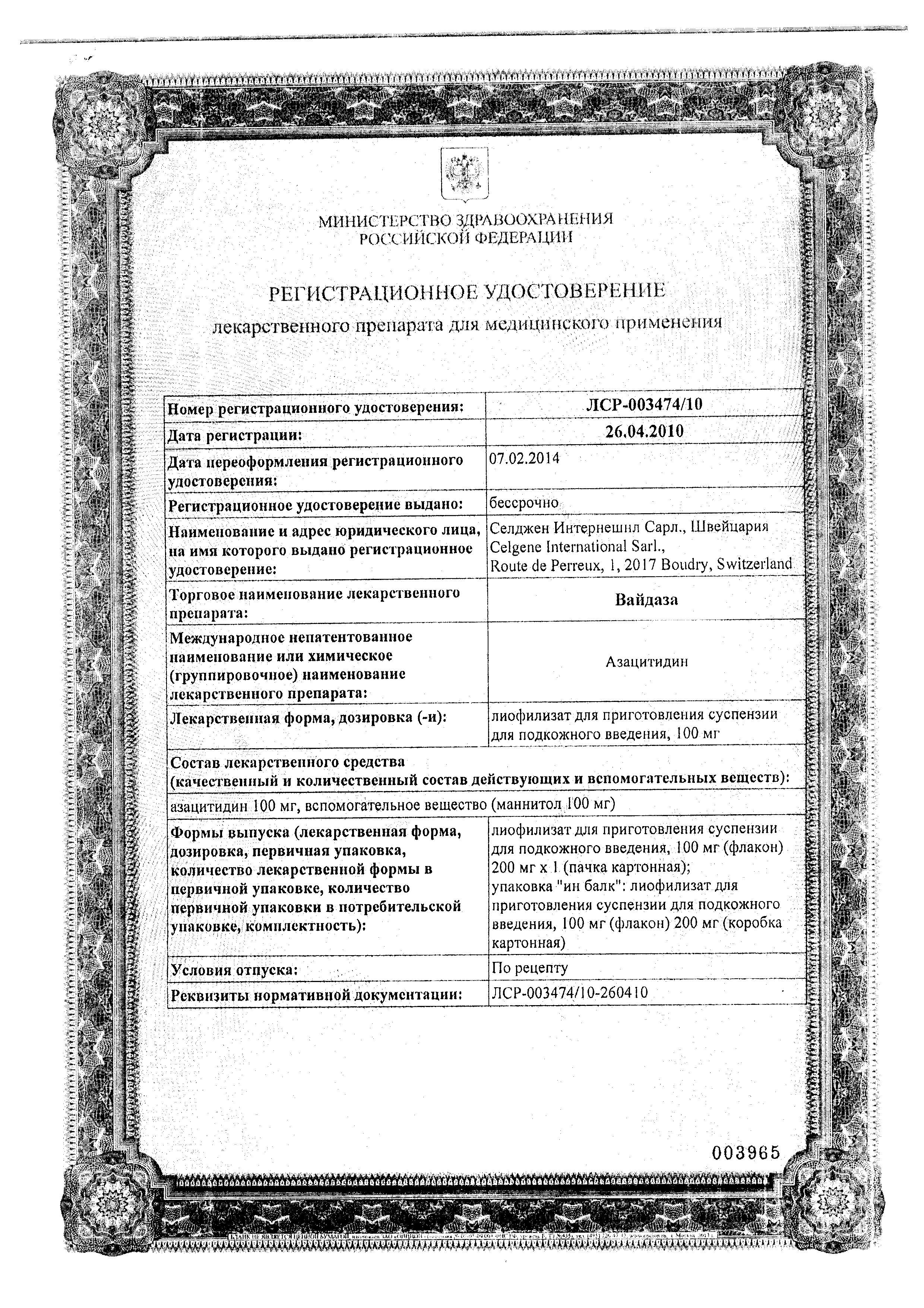 Рекомендуемая начальная доза препарата Вайдаза при проведении первого цикла терапии для всех пациентов, независимо от значений исходных гематологических показателей, составляет 75 мг/м2 поверхности тела и вводится ежедневно в течение 7 дней с последующим перерывом в 21 день (28-дневный терапевтический цикл).